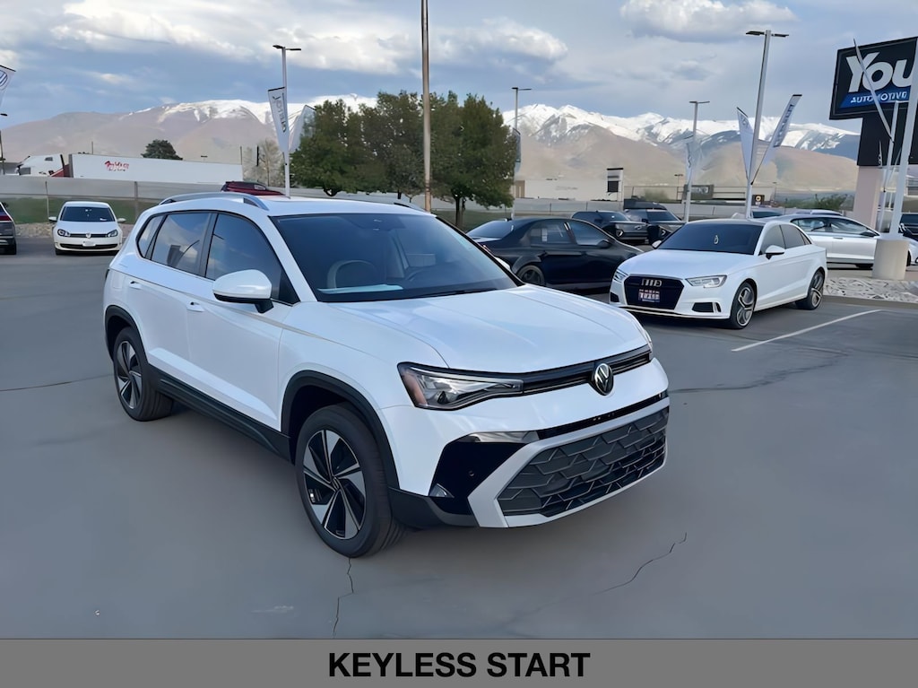 2025 Volkswagen Taos 1.5T SE Pure White 1.5L I4 Turbocharged DOHC 16V LEV3-SULEV30 174hp 8-Speed Automatic with Tiptronic AWD Panoramic Sunroof Package.